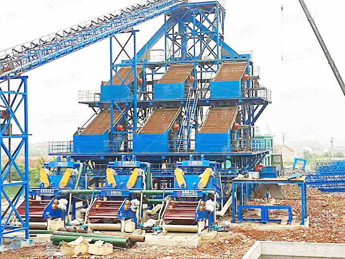 該項(xiàng)目生產(chǎn)線為河卵石制砂洗砂總包項(xiàng)目,待處理物料為河卵石機(jī)制砂,生產(chǎn)線集機(jī)制砂及石粉進(jìn)行清洗、細(xì)砂回收、尾水凈化處理,污泥壓濾干排。成品機(jī)制砂可用于當(dāng)?shù)氐牡缆、橋梁、房屋等設(shè)施建設(shè)中。目前該生產(chǎn)線已完成裝配環(huán)節(jié),即將正式投產(chǎn)。