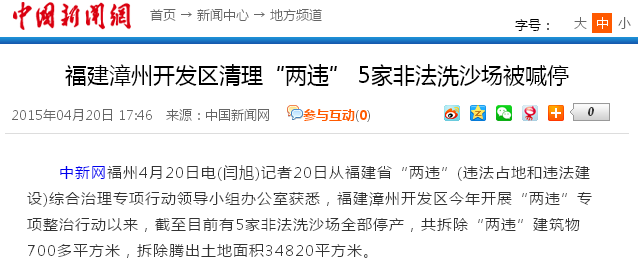 福建漳州開(kāi)發(fā)區(qū)清理“兩違” 5家非法洗沙場(chǎng)被喊停的新聞: